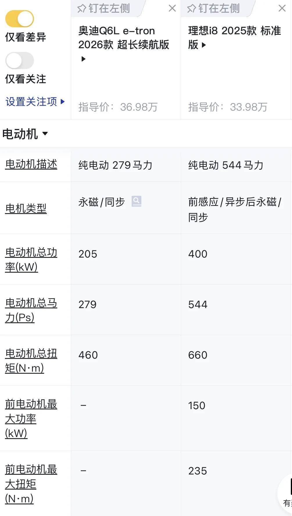 我们以同等价位的理想i8与奥迪Q6L e-tron超长续航版进行比较,不难看出在车身尺寸上前者要稍大一点,i8轴距大55毫米,前者是5门6座中大型SUV,后者是5门5座中型SUV。在动力性能上i8可以说是碾压Q6L e-tron,前者是双电机总功率达到400千瓦,而后者是后驱单电机总功率205千瓦。